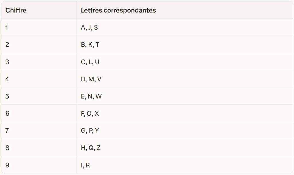 En numérologie, chaque lettre de l'alphabet correspond à un chiffre selon le tableau suivant :
