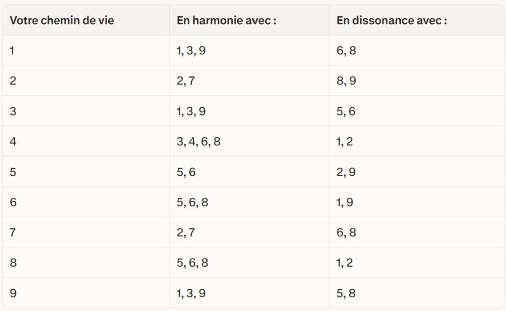 Une fois vos deux chiffres en main (chemin de vie et vibration de la plaque), vous pouvez consulter le tableau suivant :