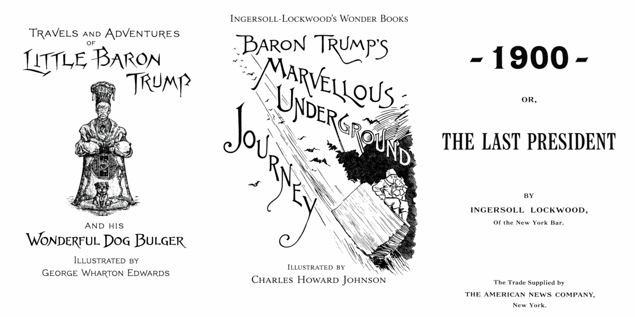 Ovrages d’Ingersoll Lockwood, ''Voyages et aventures du petit Baron Trump et de son merveilleux chien Bulger'' - 1889, ''Le merveilleux voyage souterrain de Baron Trump''-1893, 1896-''1900 ou le Dernier Président''.