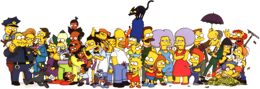 Casting des Simpson :  de gauche à droite Ralph Wiggum, Chief Wiggum, Ms Krabappel, Seymour Skinner, Scratchy the cat (foreground), Agnes Skinner, Krusty the Clown, Apu and children, Moe Szyslak, Itchy the mouse (foreground), Otto Mann, Grandpa Simpson, Homer Simpson, Santa's Little Helper (dog), Snowball (cat), Marge Simpson, Maggie Simpson (baby), Lisa Simpson, Ned Flanders, Bart Simpson, Todd Flanders, Selma Bouvier, Hans Moleman (background), Patty Bouvier, Rod Flanders, Waylon Smithers, Montgomery Burns, Jimbo Jones, Milhouse Van Houten, Groundskeeper Willie, and Martin Prince.